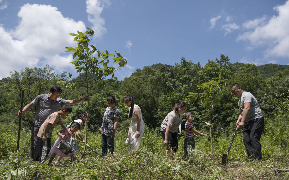 2019年7月13日,姚祖元(右一)与家人一起种树。在秦岭深处的陕西省汉中市留坝县火烧店镇,姚家五代人历时70余年深耕秦岭的故事在当地家喻户晓,传为佳话。新华社记者 陶明 摄