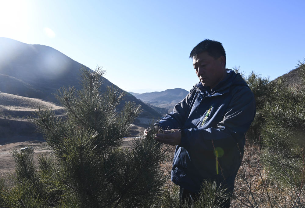 2021年12月3日,在山西省岚县附近的山上,界河口镇东口子村村民郑二小查看油松生长情况。2015年,他牵头成立了造林专业合作社,承接1350亩造林工程。合作社不仅销售了本村及周边村的苗木15万株,入社贫困户还通过赚取劳务费,人均增收5000多元。新华社记者 柴婷 摄