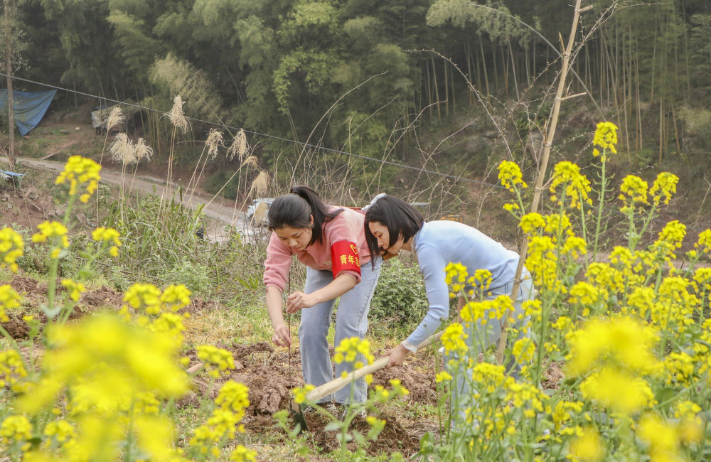 2022年3月10日,志愿者在重庆市渝北区木耳镇金刚村栽种树苗。新华社记者 黄伟 摄