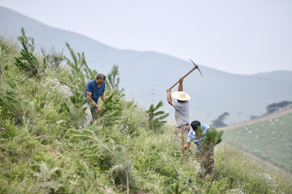 2021年7月23日,造林人员在河北省滦州市鸡冠山生态农业产业园一座荒山山坡上栽植苗木。新华社记者 牟宇 摄