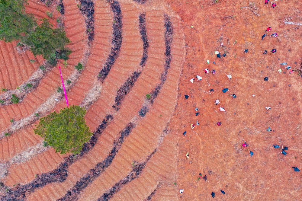 2022年2月7日,人们在贵州省黔西市绿化白族彝族乡大海子村进行义务植树(无人机照片)。新华社发(范晖 摄)