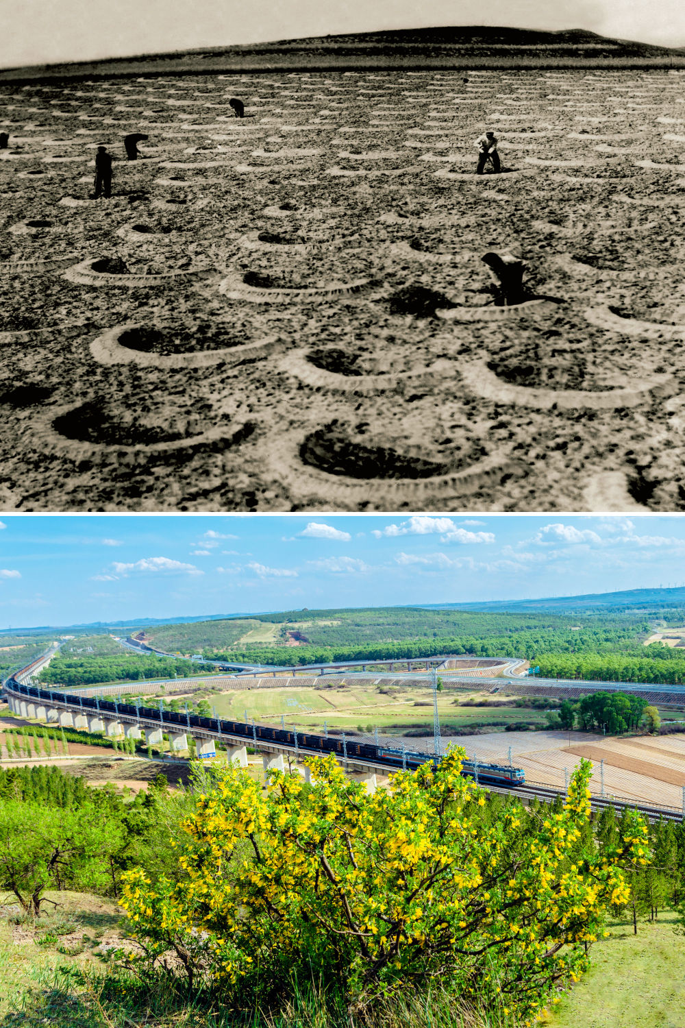 这是一张拼版照片。上图为:二十世纪六七十年代,山西省右玉县群众在荒山植树(资料照片);下图为:2021年5月18日拍摄的山西省右玉县柳沟山的景色(新华社发 李秀山摄)。