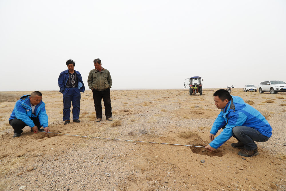 2017年3月19日,在内蒙古阿拉善盟希勃图嘎查,技术人员庞宗平(右一)与同事杨军(左一)测量牧民聂玉胜(右二)打好的准备种梭梭的坑是否合乎标准,以帮助聂玉胜更科学地种植。新华社记者 沈伯韩 摄