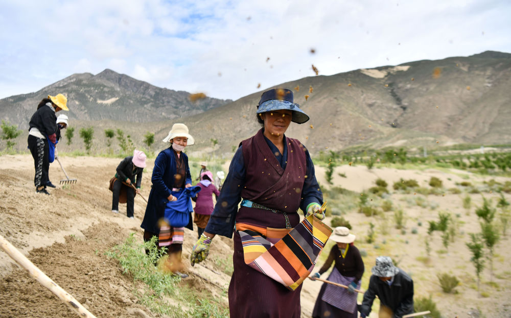 2021年7月20日,在雅鲁藏布江西藏山南段沙丘上,当地群众进行人工造林。新华社记者 晋美多吉 摄