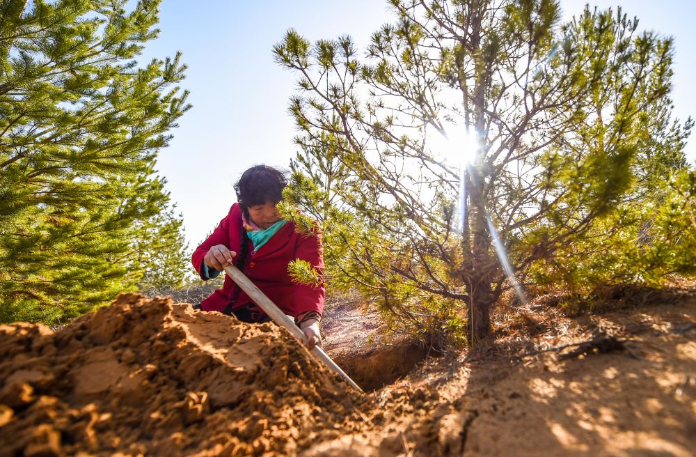 2021年3月23日,近40年来在内蒙古毛乌素沙漠坚持治沙造林的殷玉珍在挖土,查看松树根部的生长情况。新华社记者 彭源 摄