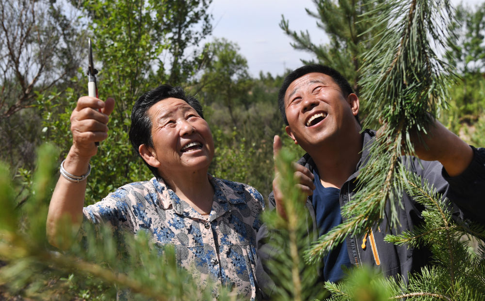 2020年5月23日,在陕西榆林,牛玉琴(左)与儿子张立强查看十年前嫁接成功的樟子松林。牛玉琴从1985年起带领全家治沙,让11万亩荒沙林草覆盖率达80%。新华社记者 陶明 摄