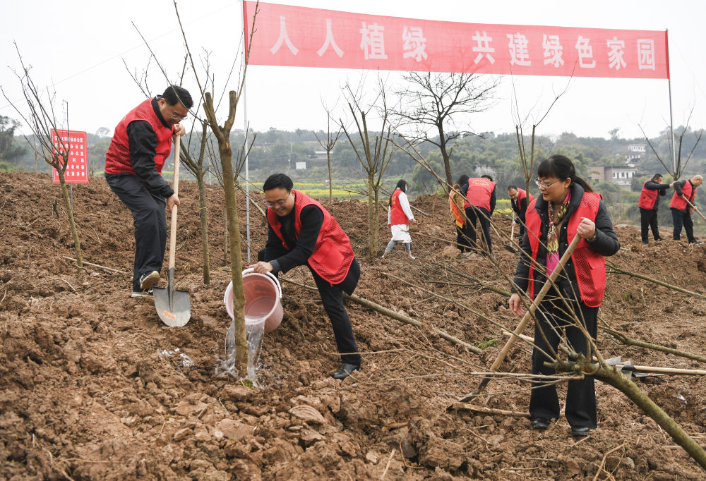 2022年3月1日,重庆市璧山区在璧泉街道鹰嘴村开展义务植树活动,为大地添新绿。新华社记者 王全超 摄