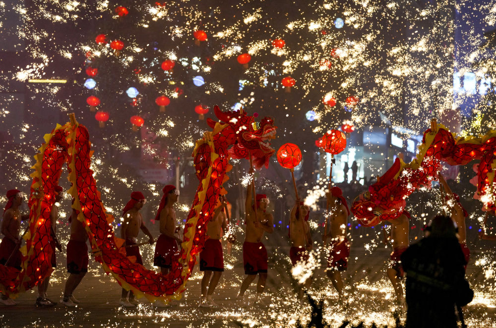 1月18日,重庆市铜梁区的龙城天街的广场上,铜梁火龙队的队员表演铜梁火龙的打铁水花。