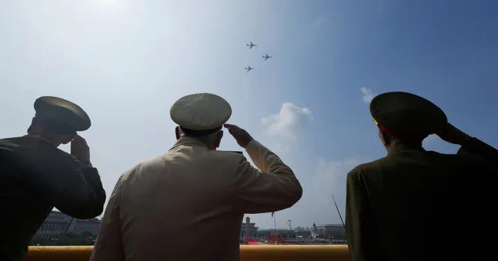 这是轰炸机梯队飞过天安门广场上空时嘉宾敬礼。新华社记者 才扬 摄