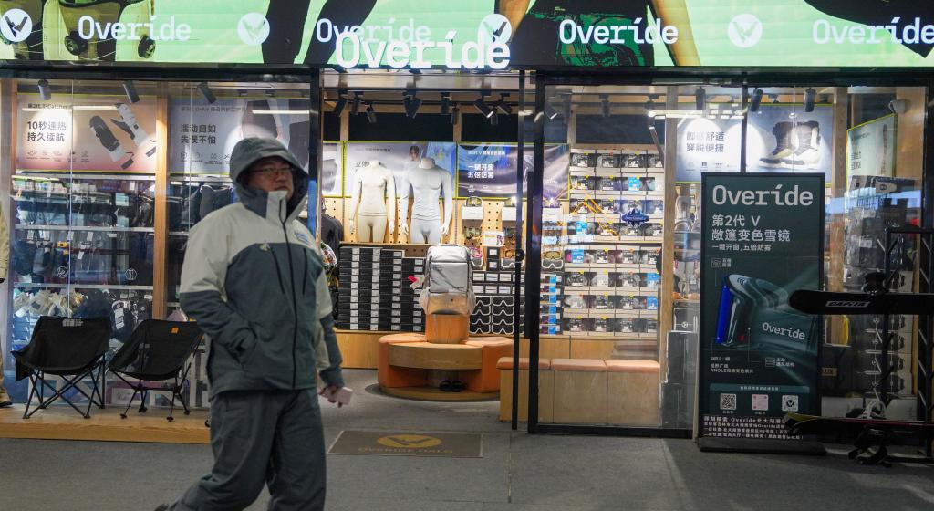 12月2日,在吉林市北大湖滑雪度假区,游客经过一家国产品牌雪具店。新华社记者 颜麟蕴 摄