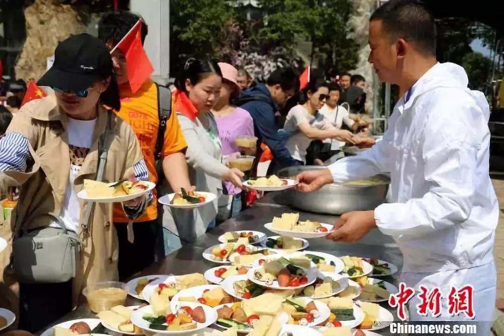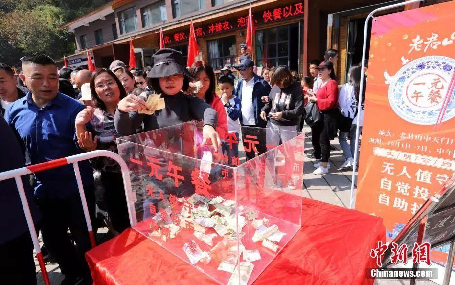 2018年10月1日当天,老君山中天门广场上的“一元午餐”摊点成为该景区最抢眼的“景观”,游客们排成长龙,等待开餐。