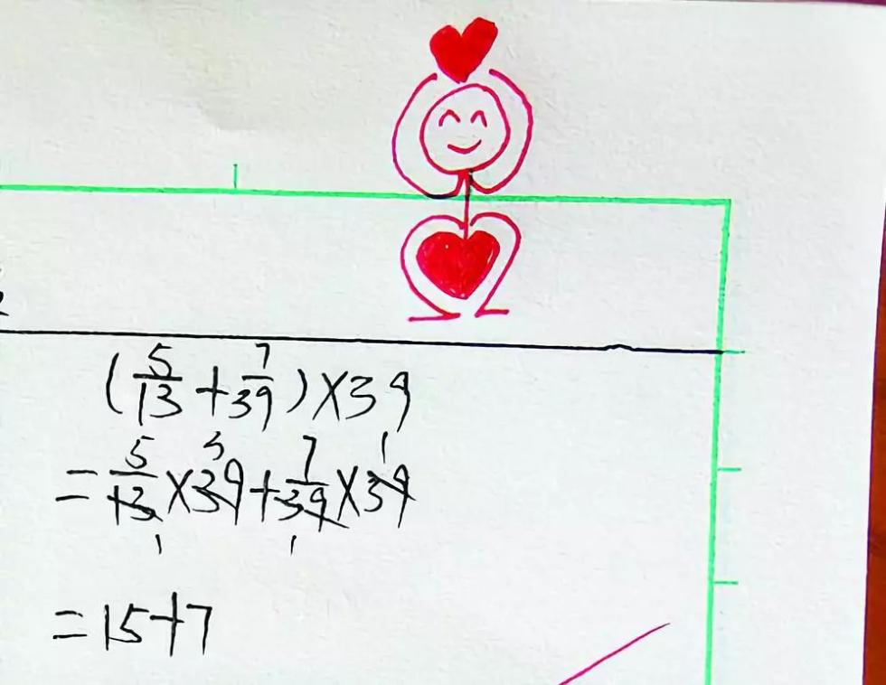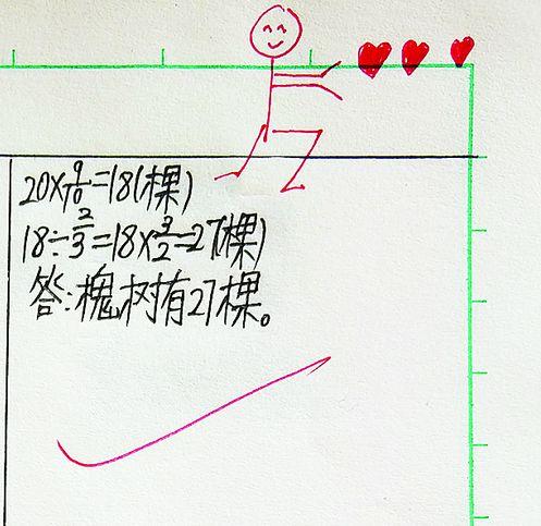 同样用画画为作业本“增色”的,还有海沧新江中心小学的数学老师余仟懿,数学作业全对且书写漂亮的,不仅可以评为“优”,还能得到老师亲手画的“比心”小人物,配上“棒棒哒”等文字,每一份作业批改都相当用心。