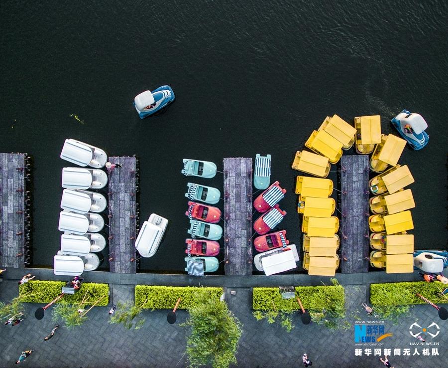 湖中小岛、游艇、绿植等物,在无人机镜头中成为另一种风景。