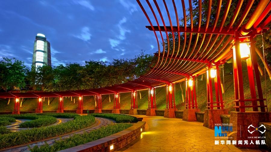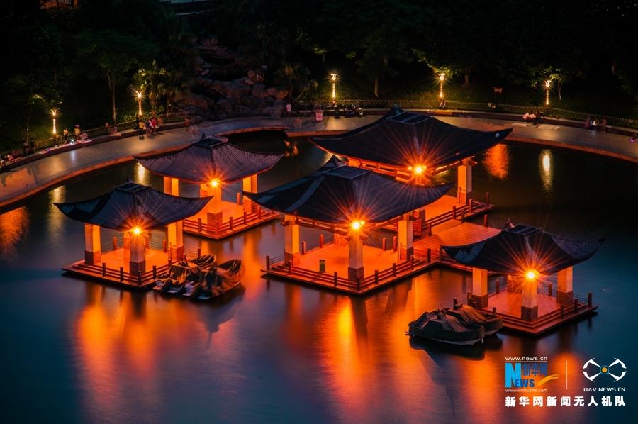傍晚,湖边凉亭,华灯齐亮,为千灯湖带来美丽的夜景。