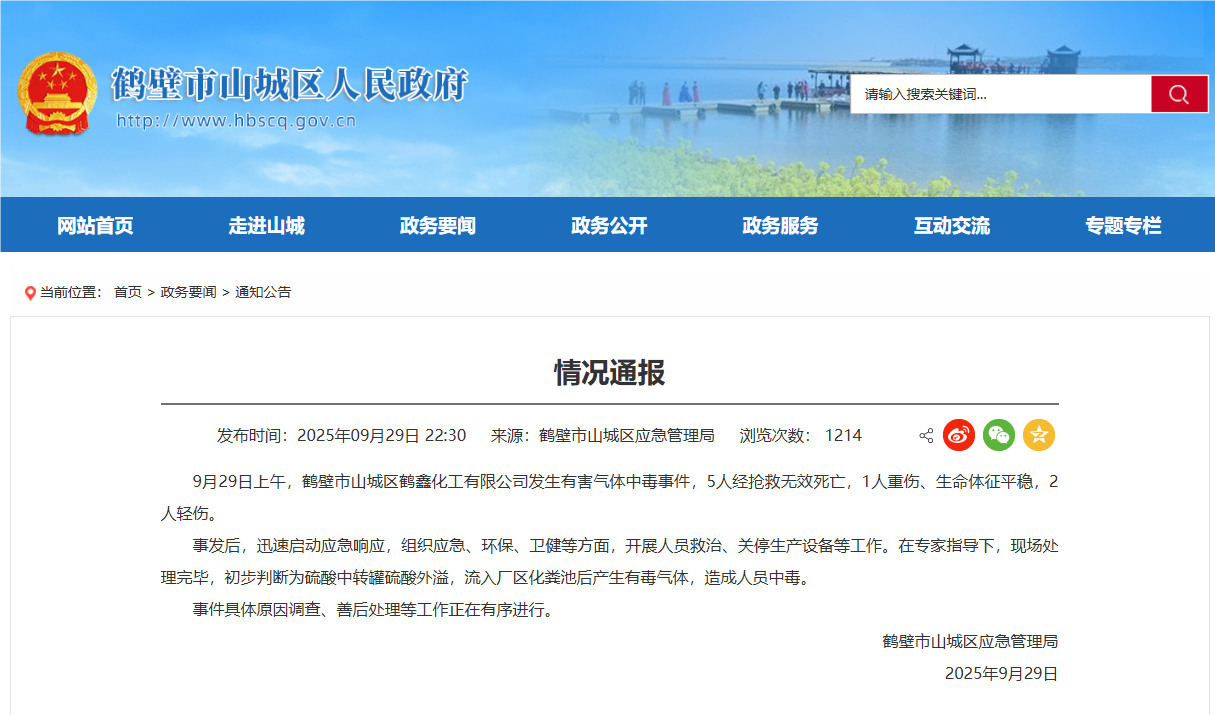 9月29日上午,鹤壁市山城区鹤鑫化工有限公司发生有害气体中毒事件,5人经抢救无效死亡,1人重伤、生命体征平稳,2人轻伤。
