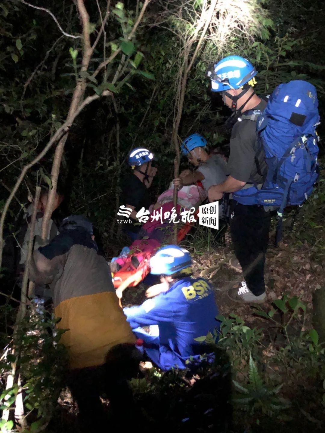 晚上10点多,椒江红枫救援队闻讯赶来增援,考虑到地形不熟,夜晚山路湿滑,民警没有让队员进山,而是留在山下接应。