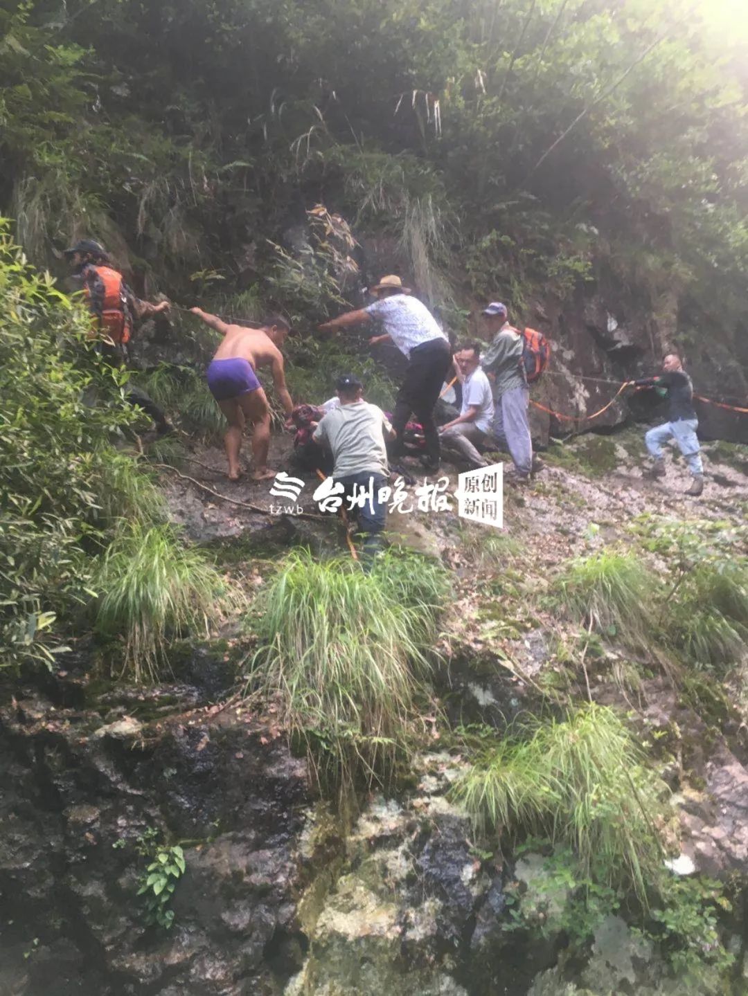 先到达的第一组8人,由王科队长带领找到事发地。因龙王十八潭山形险峻,为了避免在抬的过程中,造成伤员二次受伤,王队他们决定带伤员往涌泉镇东林村上撤。很快,第二批队员,还有金华蓝天救援队5名队员赶到。