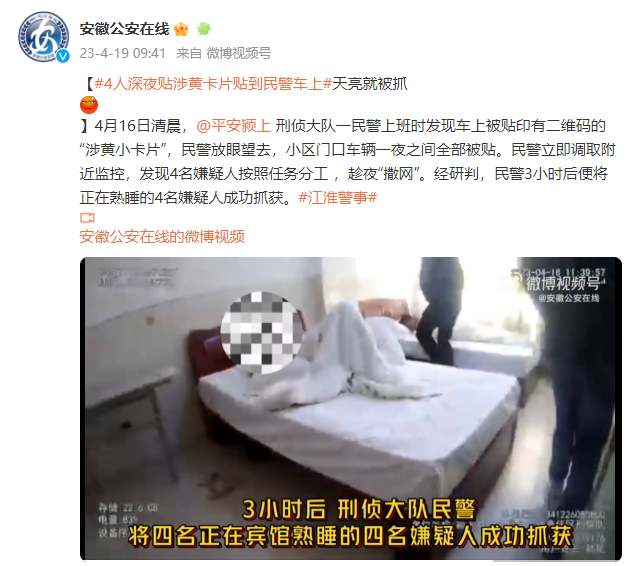 4月16日清晨,@平安颍上 刑侦大队一民警上班时发现车上被贴印有二维码的“涉黄小卡片”,民警放眼望去,小区门口车辆一夜之间全部被贴。民警立即调取附近监控,发现4名嫌疑人按照任务分工 ,趁夜“撒网”。经研判,民警3小时后便将正在熟睡的4名嫌疑人成功抓获。