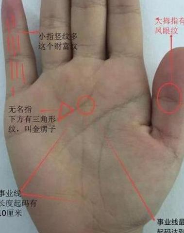 2:无名指下面,贴着感情线,出现一个三角形纹,这个叫金房子,有这个纹路的人,一生不缺钱,富贵命格,单单有这个纹路就可以确定,百万身家(不含房产)不是问题