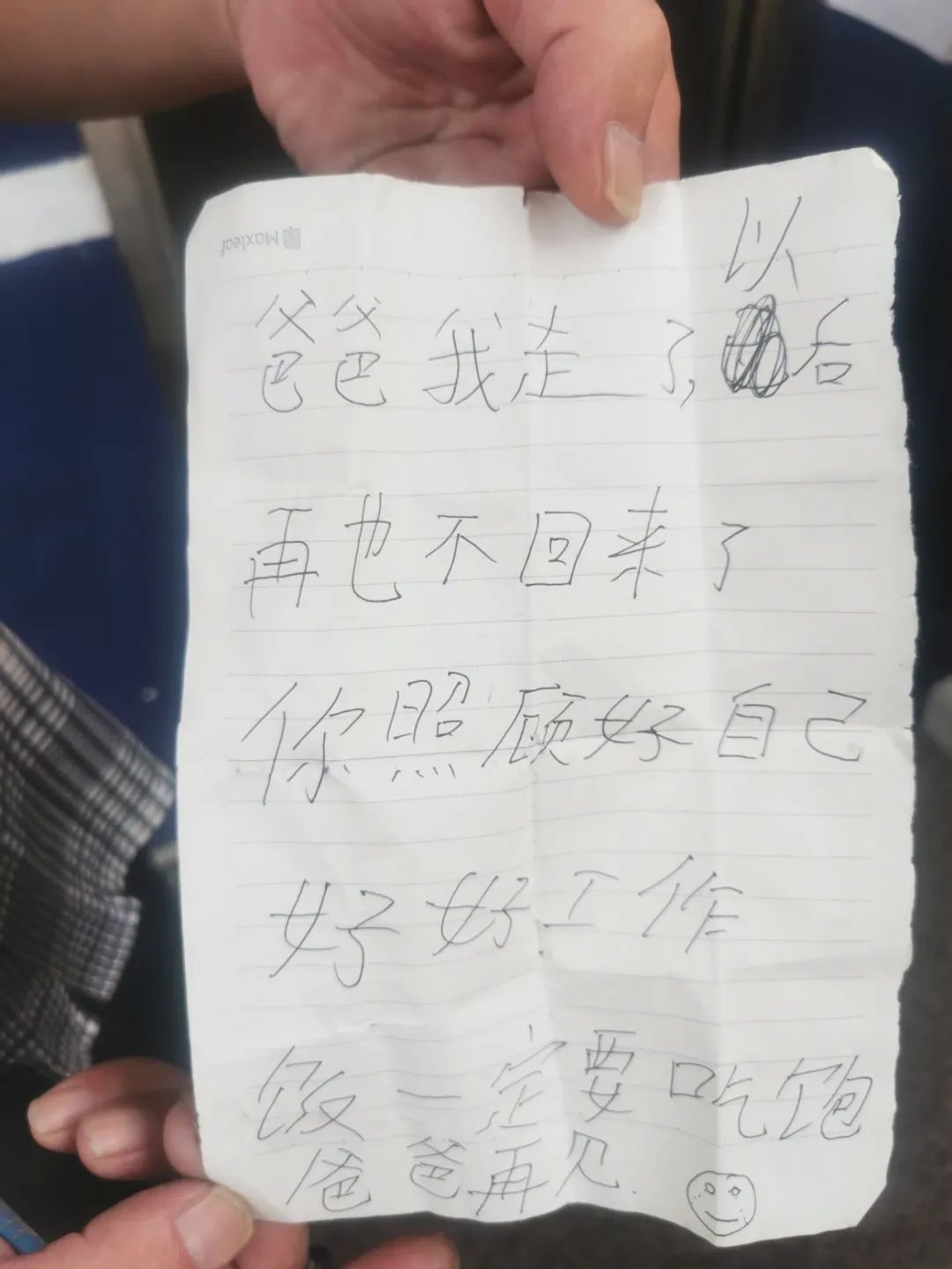 值班室内,朱先生红着眼讲道,儿子小明今年12岁,昨天早上因小明放假未完成作业被他批评了,结果小明留下一张纸条就不见了。本以为儿子闹着玩,可到晚饭前还未见踪影,昨晚上经多方寻找询问均未找到,于是赶来派出所报警求助。