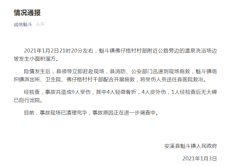 据安溪县魁斗镇人民政府微信众公号“诚信魁斗”消息:2021年1月2日21时20分左右,魁斗镇佛仔格村村部附近公路旁边的温泉洗浴场边坡发生小面积溜方。