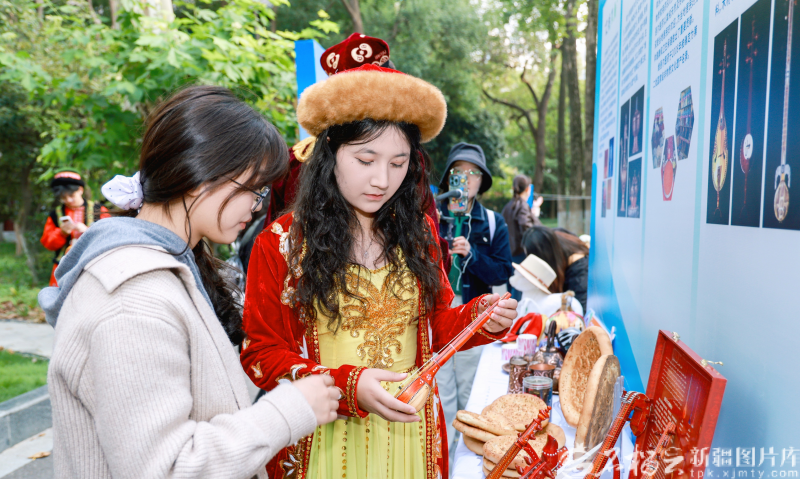 10月27日下午,南京师范大学(随园校区)学生在欣赏新疆乐器。石榴云/新疆日报记者 甘兴华摄