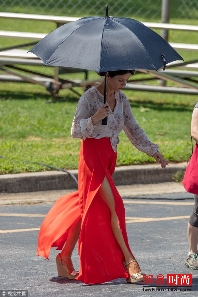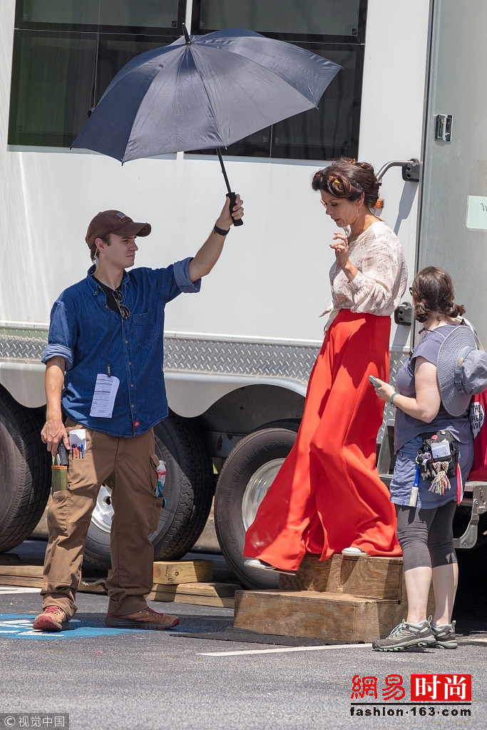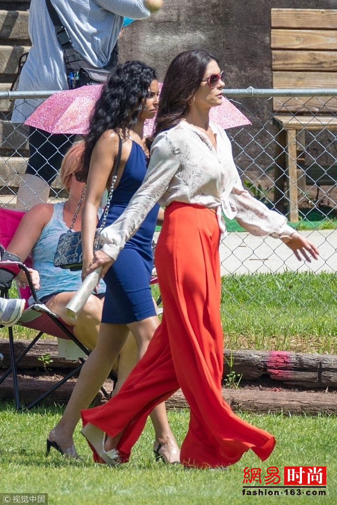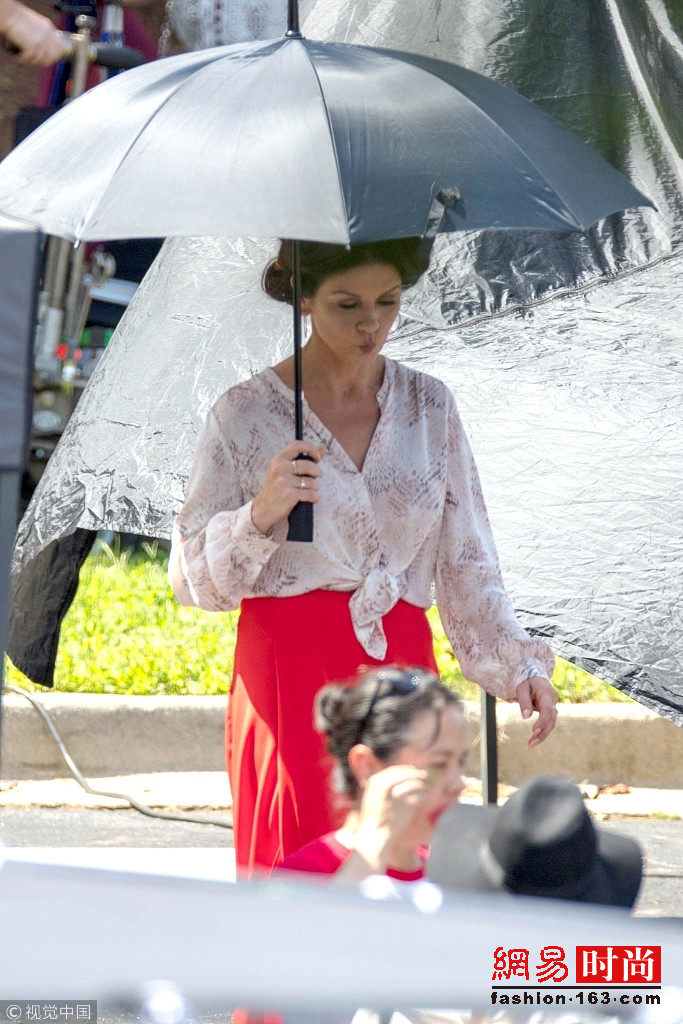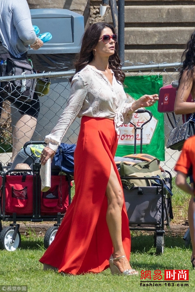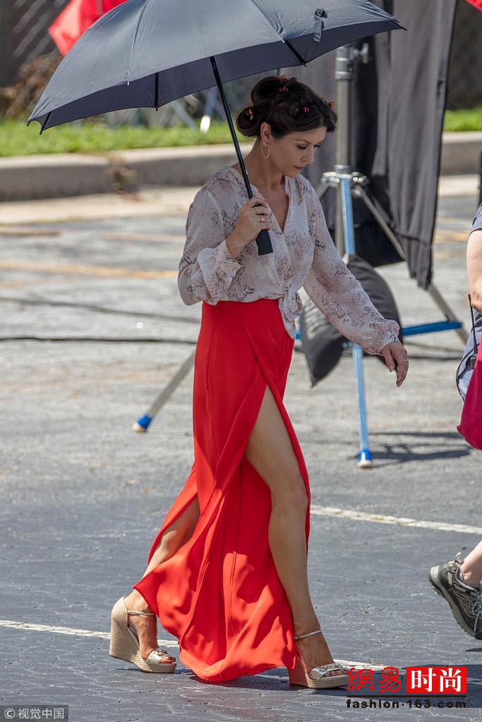 近日,凯瑟琳·泽塔·琼斯(Catherine Zeta Jones)现身拍片现场,她身穿红色开衩裙,虽然已经50岁但仍能秀美腿,侧影完美。