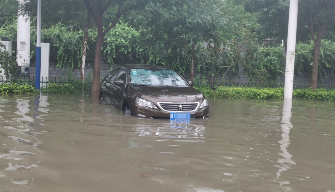 积水淹没了停在路肩上的轿车的半个车轱辘