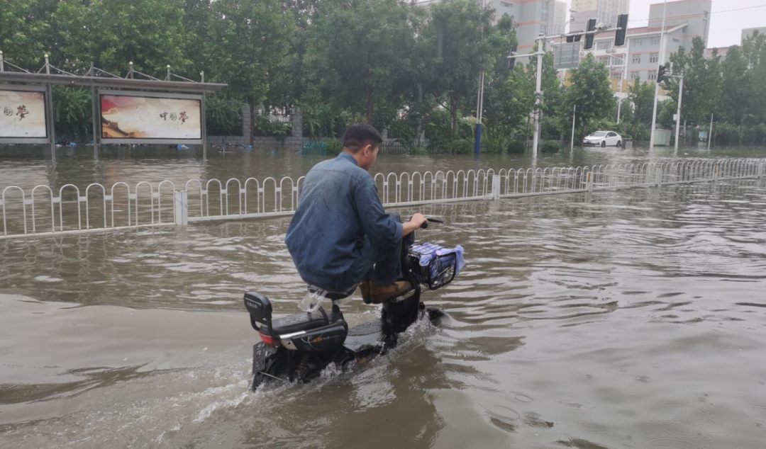 行人骑着电动车在积水中小心翼翼通过