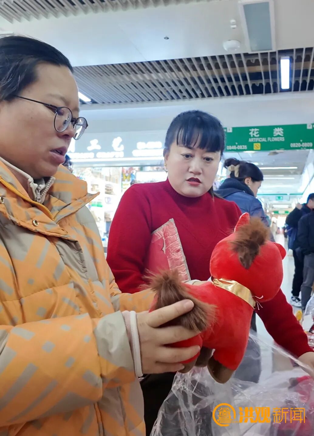 1月28日上午9时许,义乌国际商贸城一区一楼玩具专区,各家商铺陆续开门,年味渐浓。“开心姊妹”玩具店内,红彤彤的马年玩偶琳琅满目,其中“哭哭马”被摆放在最显眼的位置,圆乎乎的身形、耷拉的嘴角,憨态可掬,格外吸睛。