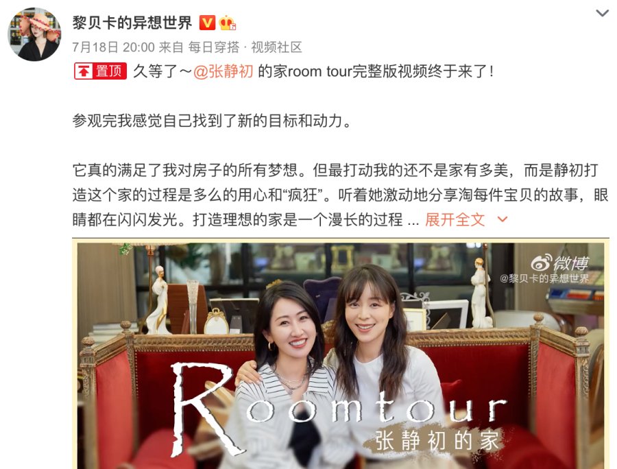早前,时尚博主黎贝卡探访了好友张静初的家,并在微博晒出美照,引得网友纷纷期待。七月中,完整版视频公布,一上线便迅速引起了大家的热烈讨论,该视频目前的播放量已达到400万+,稳居排行榜前二。