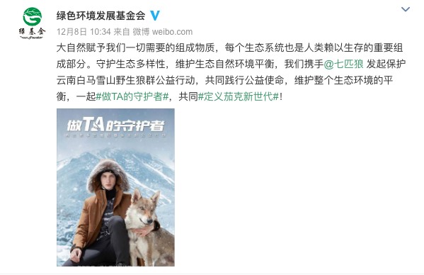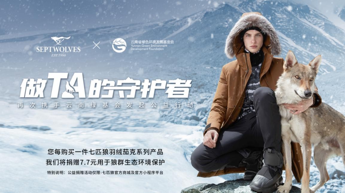 凛冬将至,七匹狼再携手云南绿基会,发起保护云南白马雪山野生狼群公益行动,增加国内对狼的种群数量与分布、生态习性、栖息地与保护等方面工作。消费者购买1件七匹狼羽绒茄克系列产品,品牌将捐赠7.7元用于云南绿基会狼群生态环境保护项目。七匹狼通过唤起公众动物保护的意识,并以实际行动践行公益使命,保护区域动物的繁殖达到生态链的平衡,号召更多人“一起做TA的守护者”。