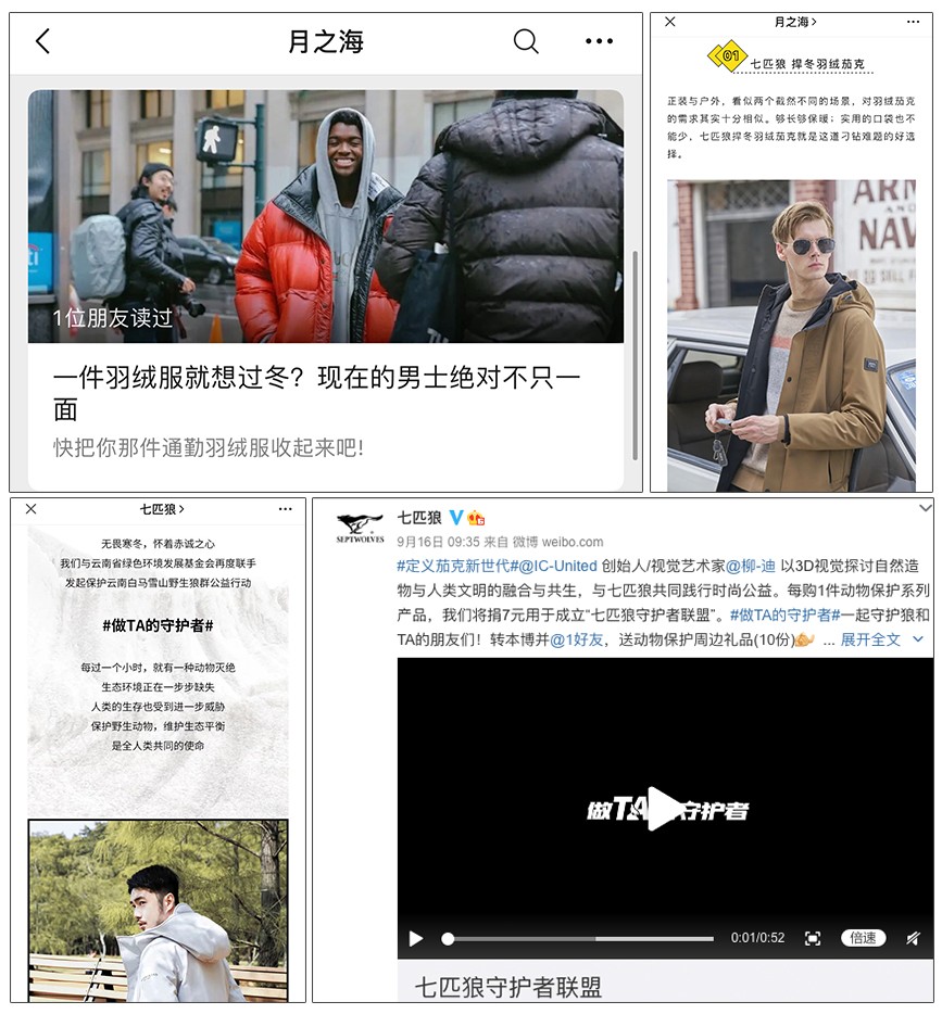 这次公益合作同时还邀请了五位时尚达人@高源Kaiko @于海航 @西部雄仔_雄俊杰 @卡里-秦樊 @萌叔小熊猫 一起,通过展示七匹狼羽绒茄克产品,阐述七匹狼品牌的公益价值,作为纵深度群体的一次延伸,同时达到传播公益活动的目的。
