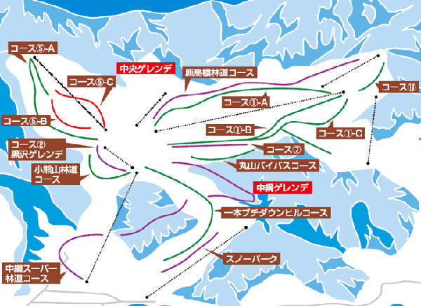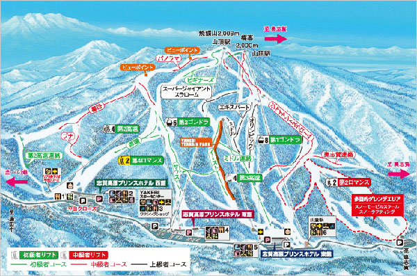 从滑雪场山顶或中间地点有联络通道通往旁边的“奥志贺高原滑雪场”,如果购买通票,可以体验更加的雪道。