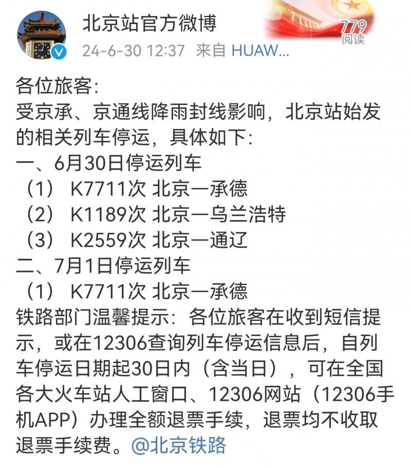 受京承、京通线降雨封线影响,北京站部分始发列车停运。6月30日停运列车 :K7711次,北京—承德;K1189次,北京—乌兰浩特; K2559次,北京—通辽。7月1日停运列车:K7711次,北京—承德。