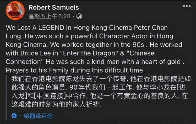 惊闻噩耗,美国导演Robert Samuels发文:“我们失去一位香港电影界传奇人物陈龙,我们90年代一起工作过,他曾与李小龙合作过《龙争虎斗》《精武门》,在这个困难时期为他的家人祈祷。”