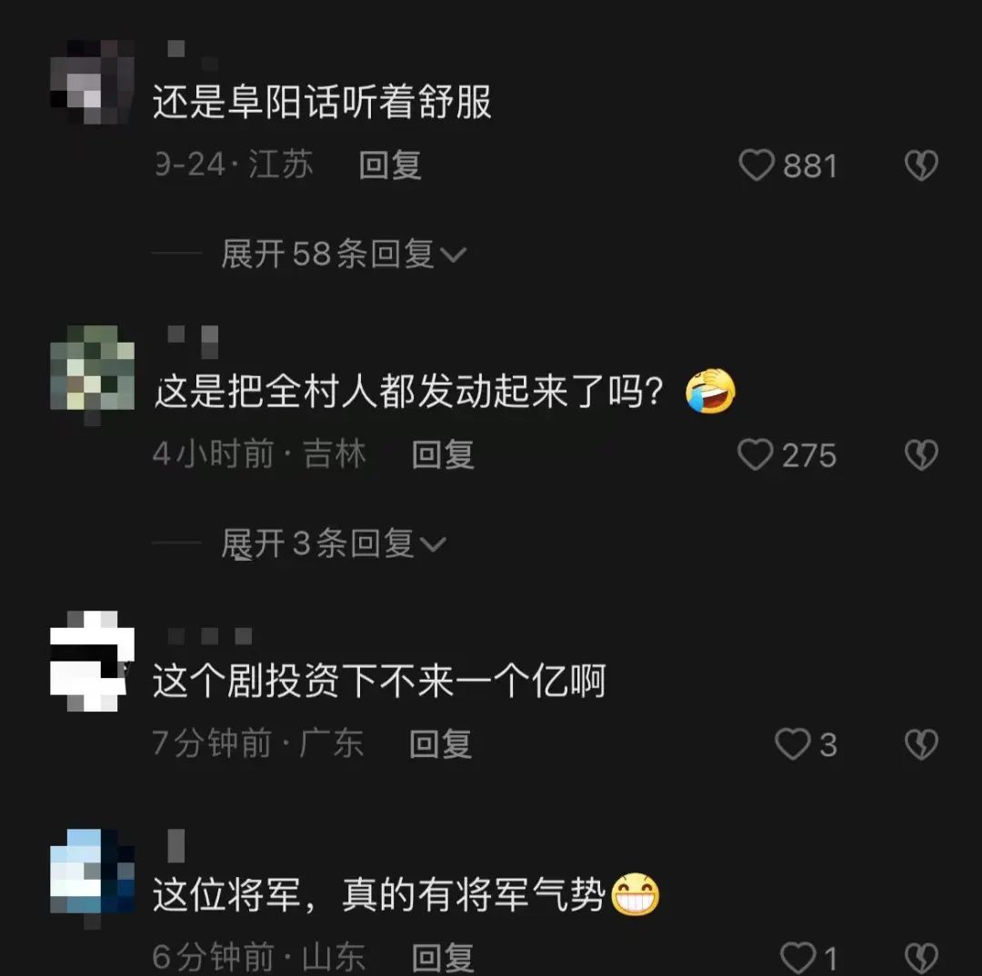 视频下方,网友纷纷表示“太搞笑了”,评论道:“还是阜阳话听着舒服”“这是把全村人都发动起来了”“这群演数量比隋唐英雄传还多”。