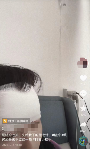 该女子在视频中@了其“丈夫”的账号。4日至5日,其“丈夫”先后发布两条自己头缠纱布、正在吊针的视频,并表示“刚结婚七天,头给我干的缝七针”“谢谢大家关心,CT已做,过两天复查,挂挂针就没事了。”该账号此前还发布了两人的结婚照。