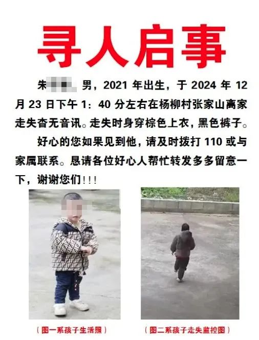 12月24日,重庆市,多位网友转发一则寻人启事:武隆区白马镇杨柳村3岁男孩小朱在23日下午走失,快两天了,还没有收到关于小朱的有效信息。