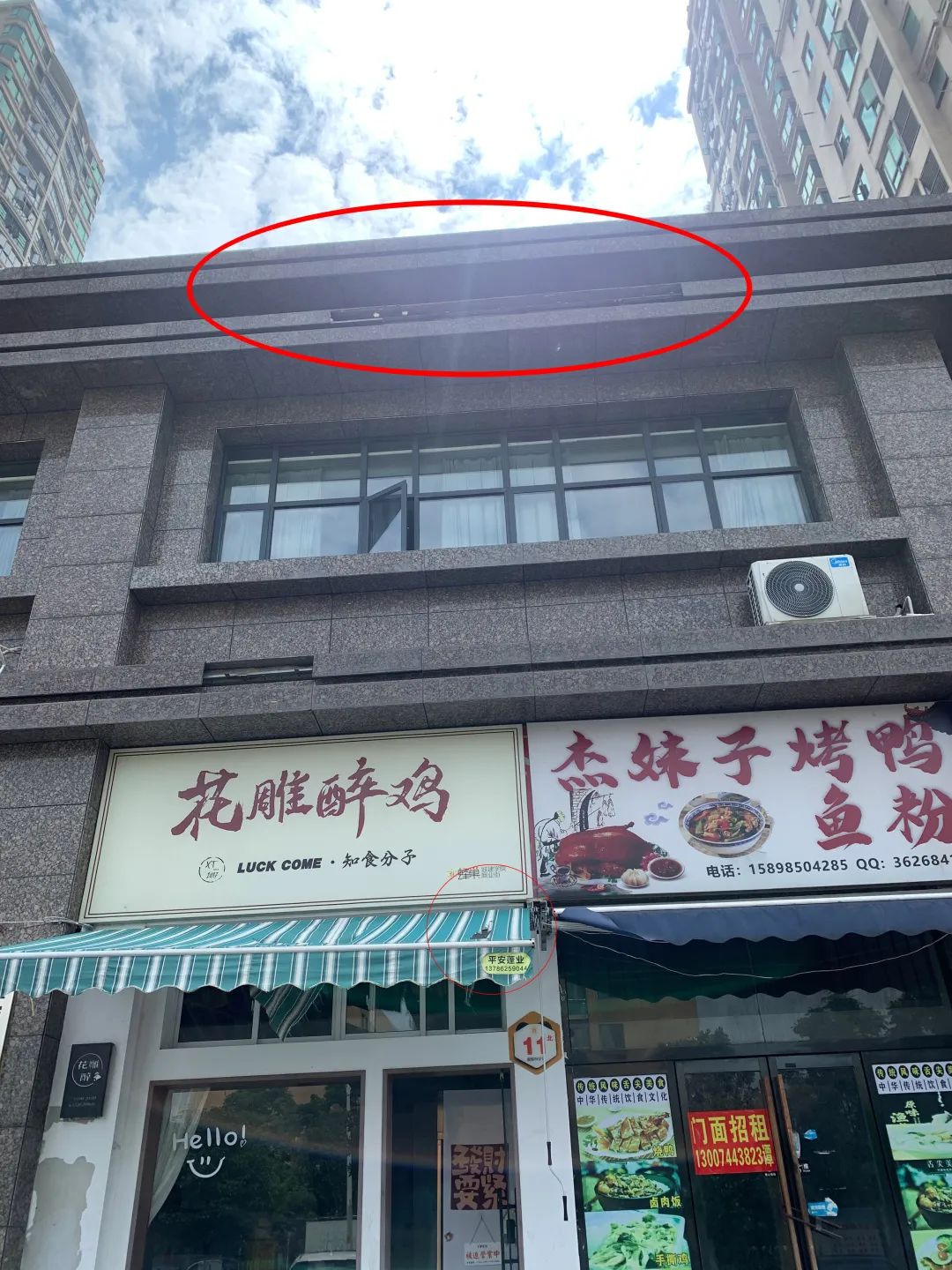 △墙面瓷砖掉落的地方,以及被砸坏的雨棚。
