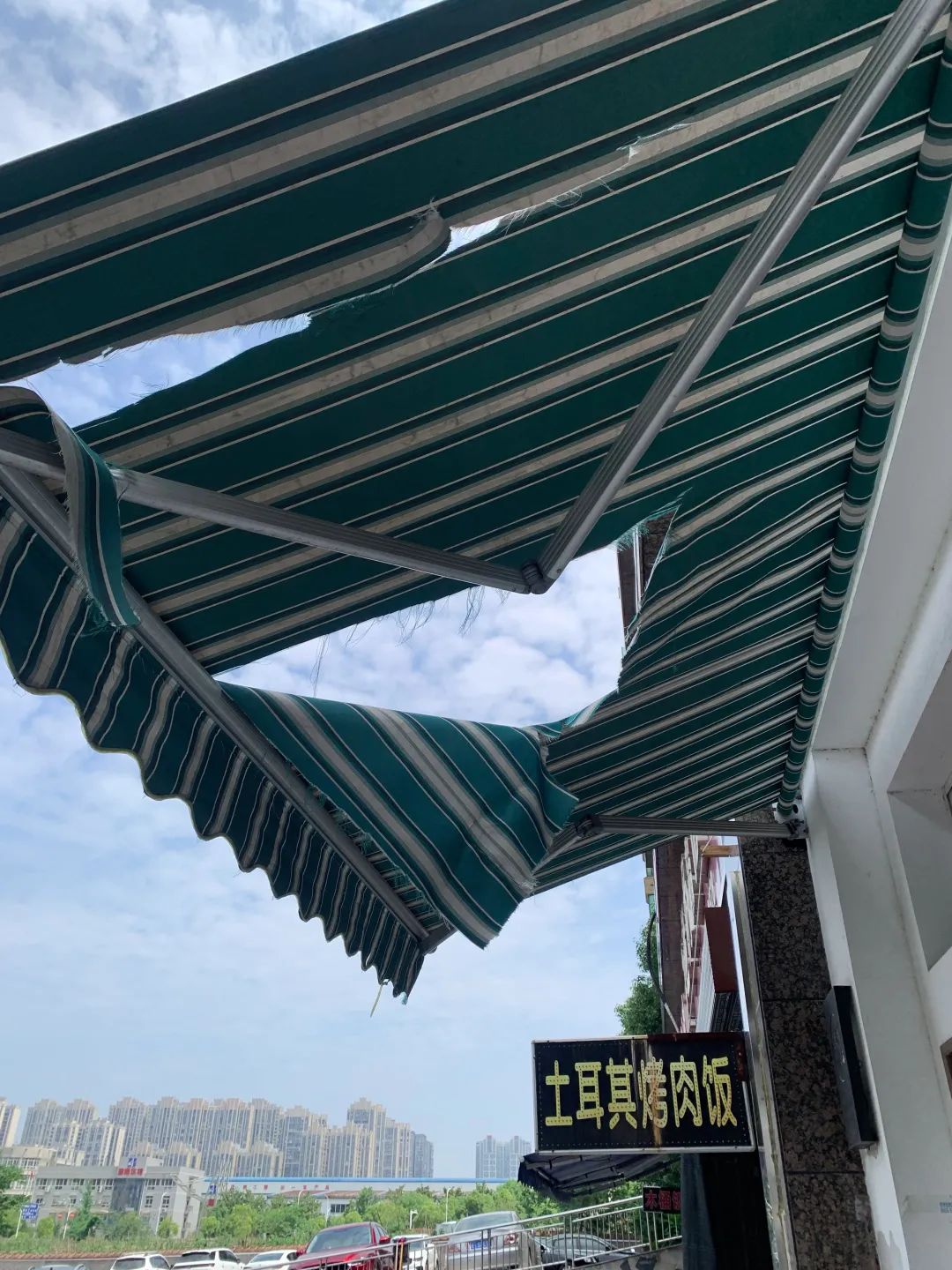△6月4日晚上七点半左右,汤女士店里的雨棚被砸坏。