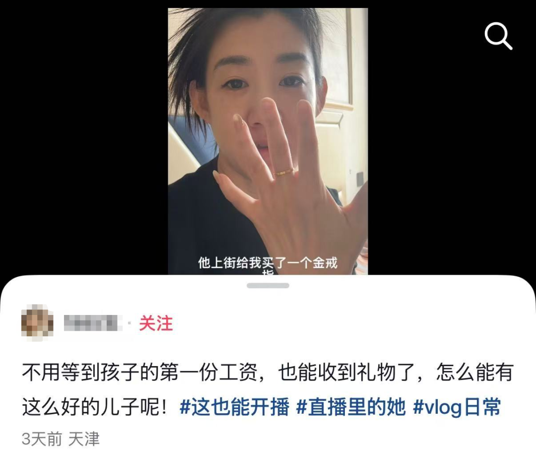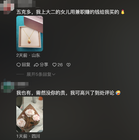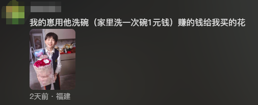 在何女士视频的评论区,不少网友也晒出自己家的“同款”孩子,“我的崽用他洗碗(家里洗一次碗1元钱)赚的钱给我买的花”“我的皮夹克,15岁那年用压岁钱偷偷给我买了一台手机,后面我生日给我送了好几双鞋”“我们家七岁宝给我买了一个金戒指”……