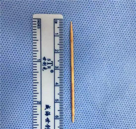 接诊的胸心外科主任医师杨继承教授表示,自己从医这么多年,见过形形色色的胸腔异物,但牙签从体外刺入的还是头一次遇见,因为按照常理推断,牙签在不折断的情况下完整地刺入胸腔的可能性不大。他仔细查看了位于刘强右乳上方的一个细小的伤口,再结合 CT 显示,发现刘强的右肺确实有一根完整的,且长度、粗细跟牙签一般的异物,才明确诊断。