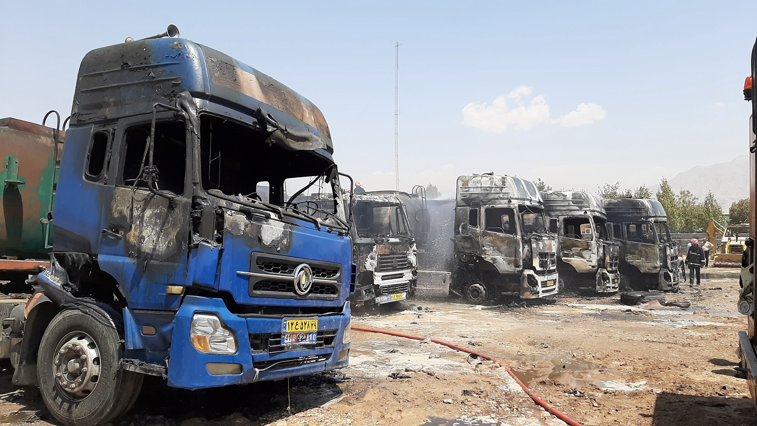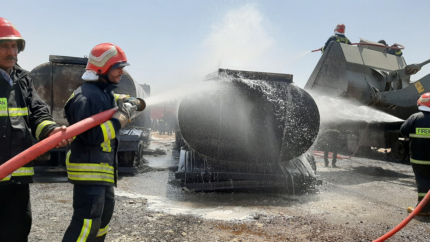 当地时间2020年7月28日,伊朗西部克尔曼沙赫省一工业园区内的油罐车发生爆炸,引发大火。灭火工作正在进行中。