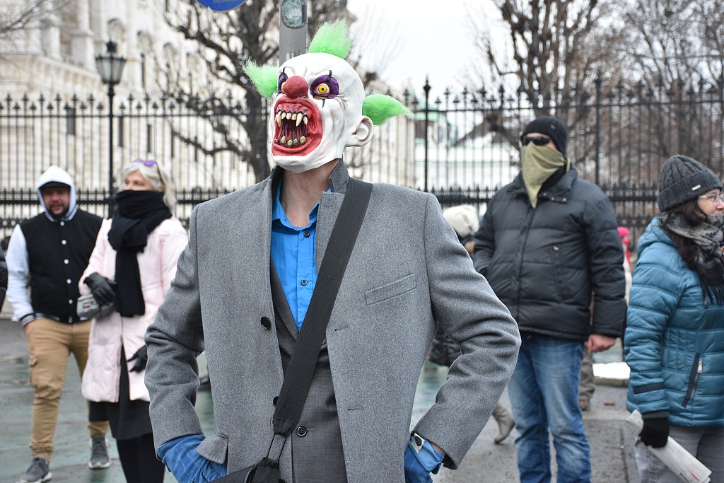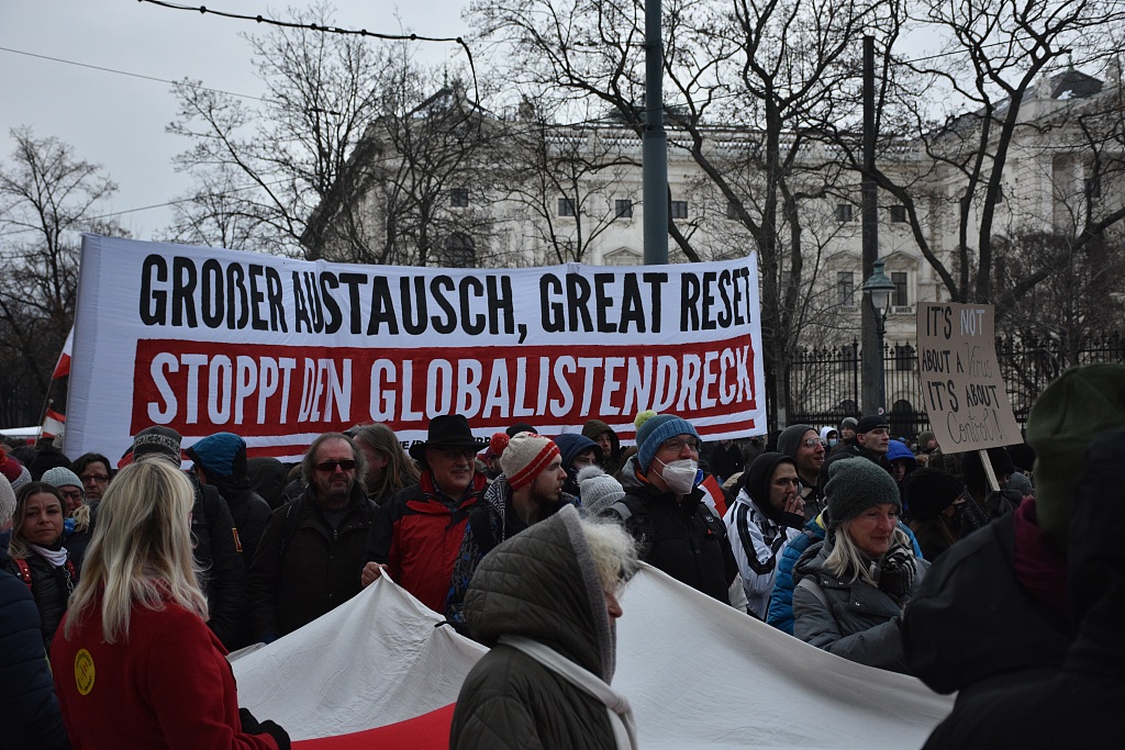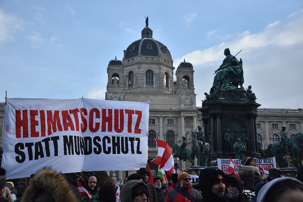 当地时间2021年1月16日,奥地利首都维也纳,成千上万的民众涌上奥地利首都维也纳的街头,抗议政府为遏制新冠疫情而实施的封锁限制。在抗议现场,大多数民众都没有佩戴口罩,甚至还在相互亲吻和拥抱。