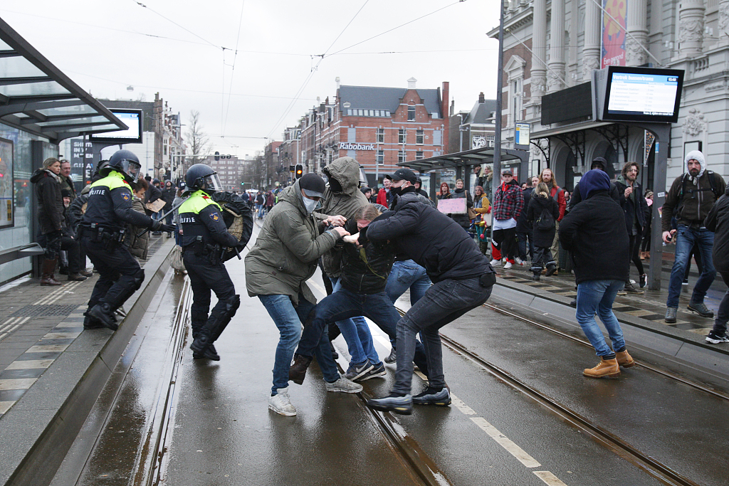 当地时间2021年1月17日,荷兰阿姆斯特丹,近2000名民众17日走上街头抗议政府为应对疫情采取的封锁措施。对此,当地警察用高压水枪将抗议人群驱散,与抗议者发生冲突。在场的示威者并未佩戴口罩或保持社交间距。