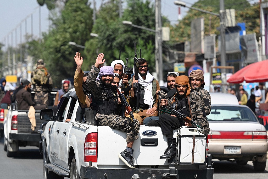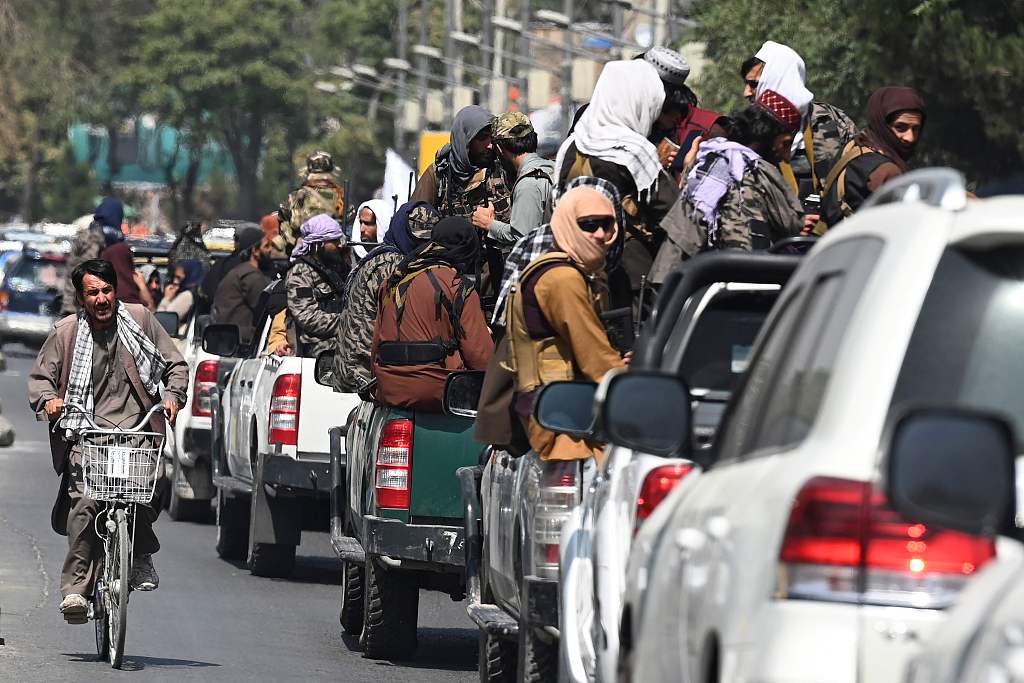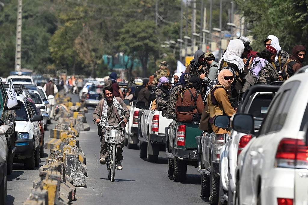 当地时间2021年9月2日,阿富汗喀布尔,塔利班成员乘车在喀布尔街头巡逻。