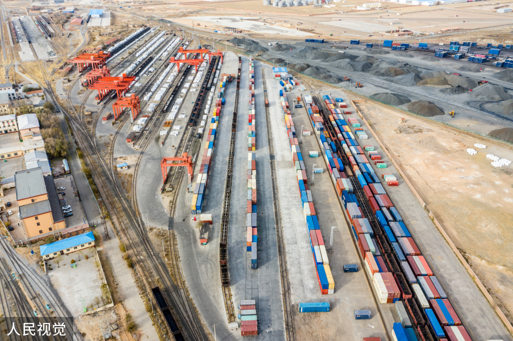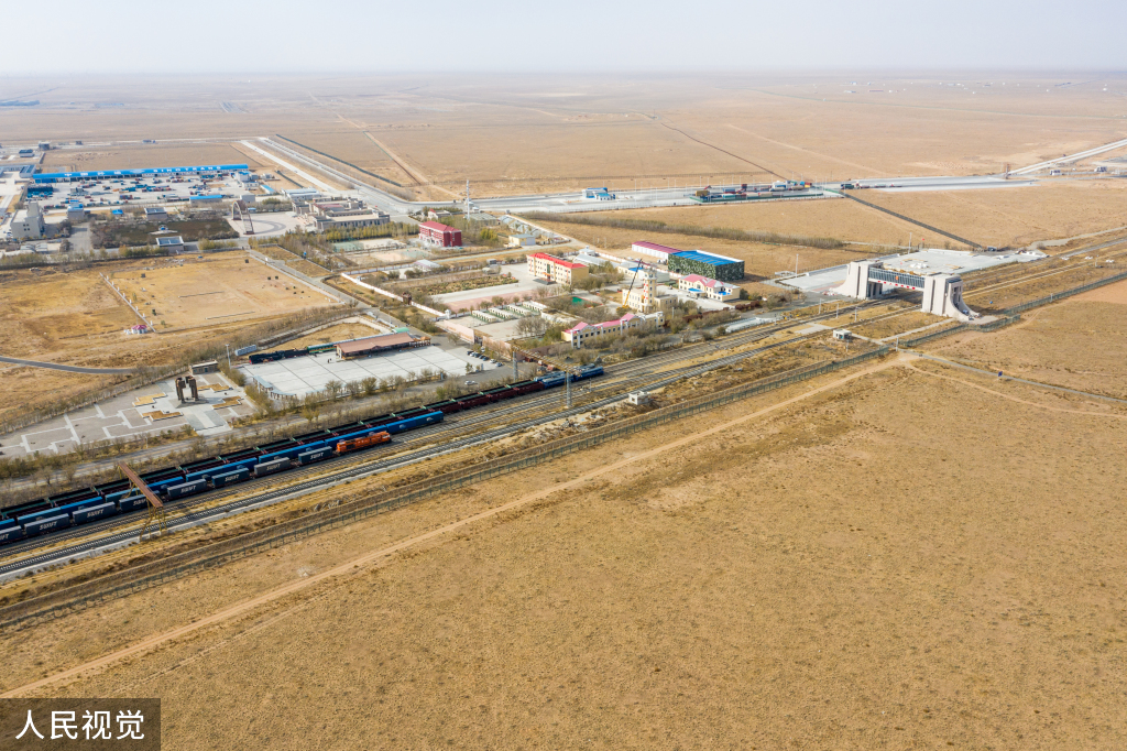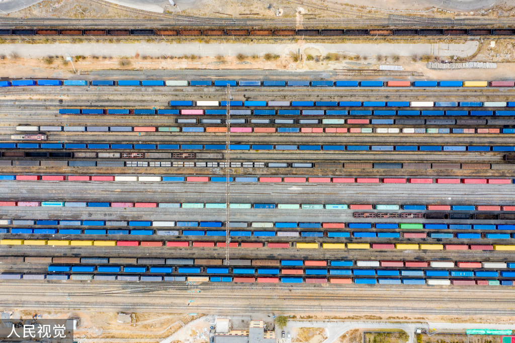 2022年10月25日,内蒙古锡林郭勒,航拍二连浩特铁路货场。