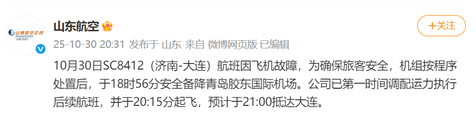 @山东航空 消息,10月30日SC8412(济南-大连)航班因飞机故障,为确保旅客安全,机组按程序处置后,于18时56分安全备降青岛胶东国际机场。公司已第一时间调配运力执行后续航班,并于20:15分起飞,预计于21:00抵达大连。