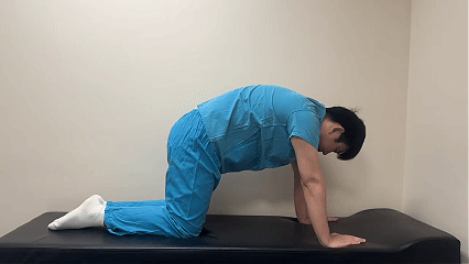 5、猫驼式伸展运动:跪在床垫上,手腕对齐肩膀,膝盖对齐髋部,吸气塌腰抬头翘臀做猫式,呼气弓背低头含胸做驼式。一呼一吸为一个动作,15个一组,每天完成2-3组。